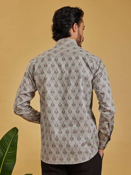 Men’s Beige Jacquard Cotton Shirt – Subtle Woven Motif Full Sleeve | No Pocket