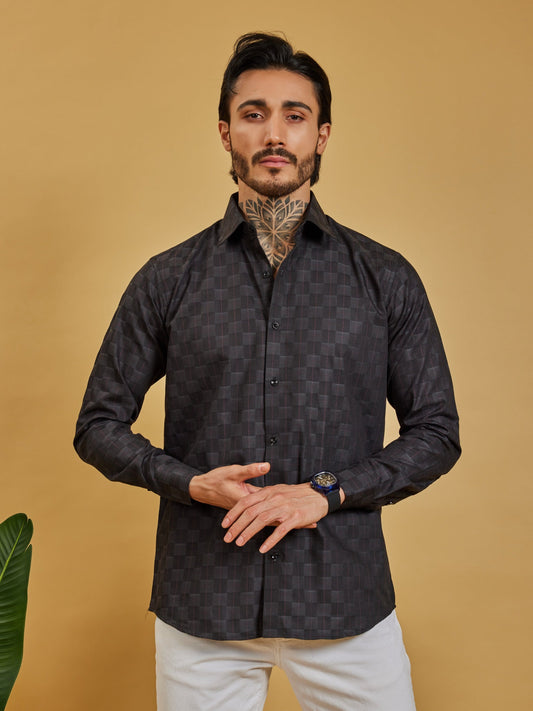 Men’s Black Jacquard Cotton Shirt – Tonal Check Weave Full Sleeve | No Pocket