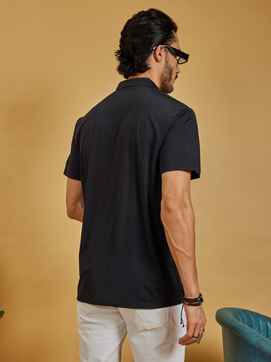 Men’s Black Textured Shirt – Cotton Blend Open Collar | Half Sleeve | Minimal Look