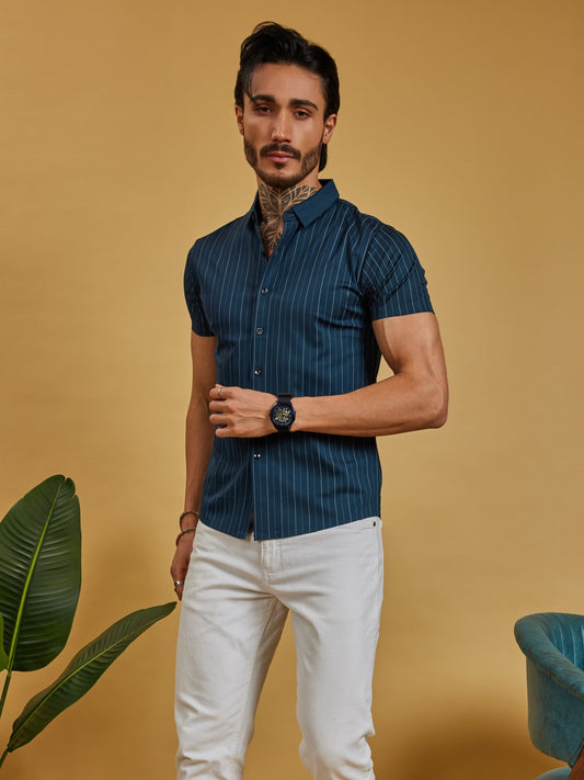 Men’s Premium Nylon Half Sleeve Shirt – Dark Teal Blue Vertical Stripes (No Pocket)