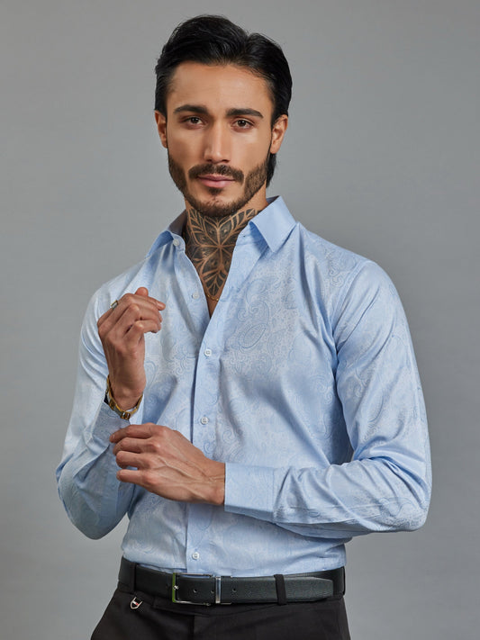 Men’s Sky Blue Jacquard Cotton Shirt – Barik Design Full Sleeve | Premium Casual Look
