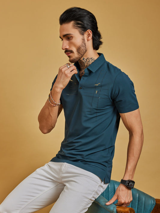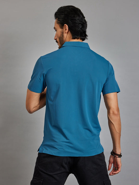 Men’s Premium Stitchless Polo T-Shirt – Ocean Teal Blue Hotfix Chest Design Nylon Fabric