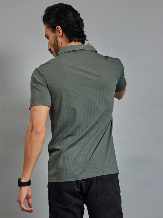 Men’s Sage Green Resort Polo T-Shirt - Popcorn Knit & Net Panel, Lightweight & Breathable